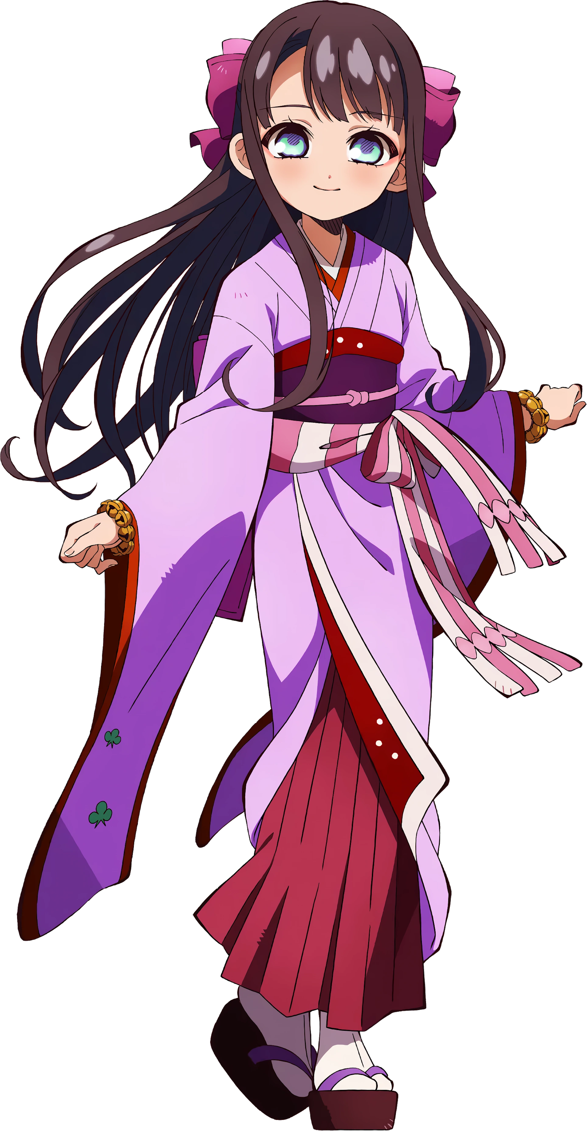 She has long black hair, in some picture drawing by Aida her hair could be reddish brown, similar to Aoi's, pale blue eyes, and pale skin. According to the September 2020 issue's color spread, her Kimono is a pale lavender with magenta hues and flower patterns on the sleeves, while her obi is a deeper red. She wears a pair of Zori shoes and plain tabi socks. On both wrists, she wears bracelets composed of bells. She gave one of them to Nene, stating that they served as protection charms.[2]
