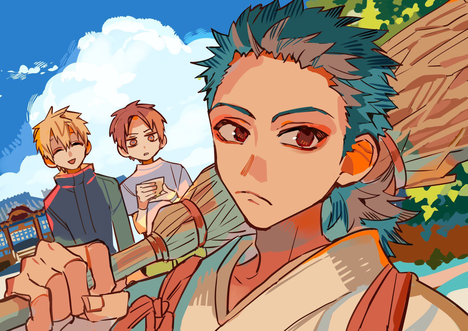 Outside of the shrine, Teru is victoriously holding up a small chest in his hand, exclaiming that they're going to the boundary. Akane is more ruffled in contrast, muttering an apology to the people of the shrine.