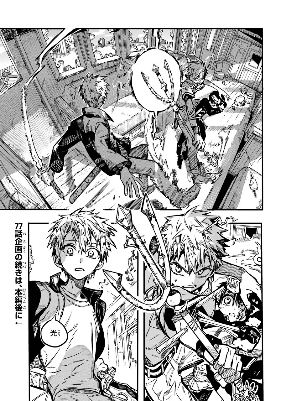 The chapter starts off with a colored page announcing the results of the Chapter 77 Project, the "Situation Vote", where fans voted for which character they thought was the best fit in a handful of specific situations.