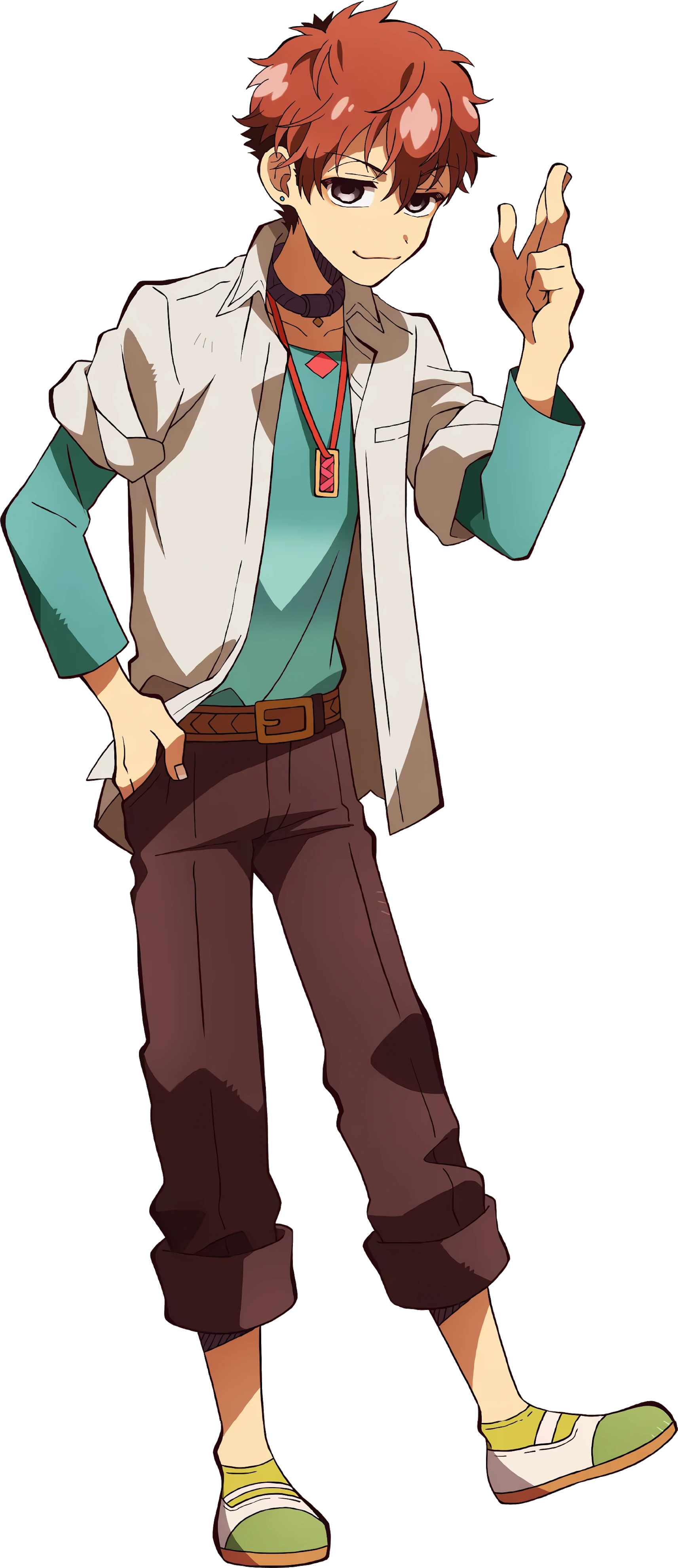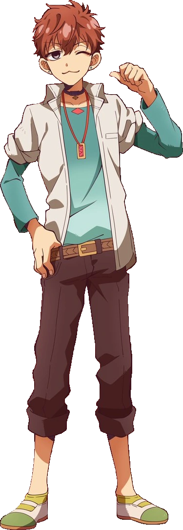 He wears the usual Kamome Academy High School boy's uniform. His uniform shirt is unbuttoned and has its sleeves rolled up to reveal a teal, long-sleeved t-shirt. He also wears a germanium necklace with a red cord, that was a present from Sakura[1], and a black sports necklace.