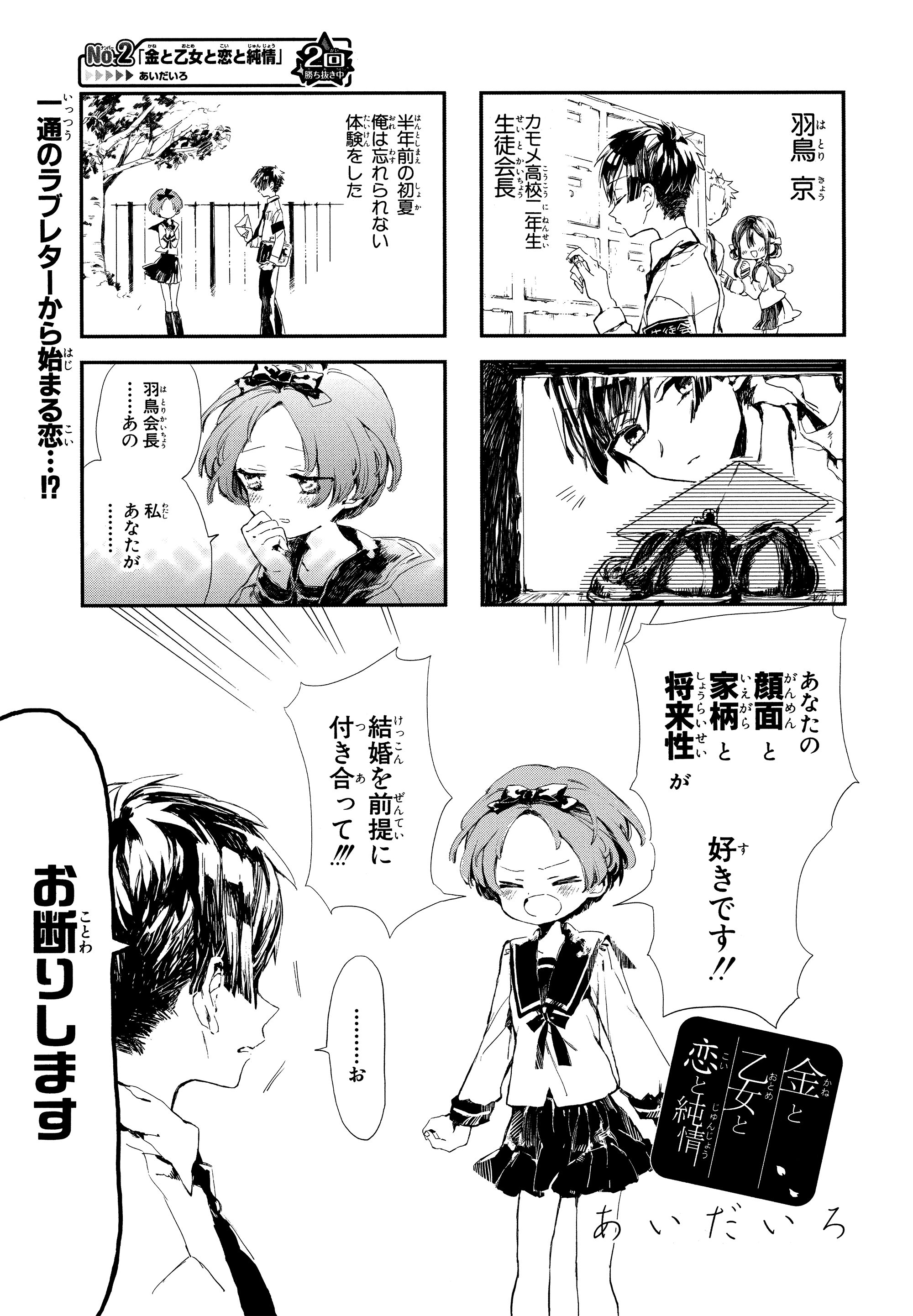 Money, Maidens, Love, and Innocence (金と乙女と恋と純情 Kane to Otome to Koi to Junjou?) is a one-shot manga written and illustrated by AidaIro. It was actually created prior to the creation of Jibaku Shounen Hanako-kun, and stars Shigaraki Chitose, a first-year student, and her seemingly weird actions of love towards Hatori Kyou, a second-year student and the Student Council President.