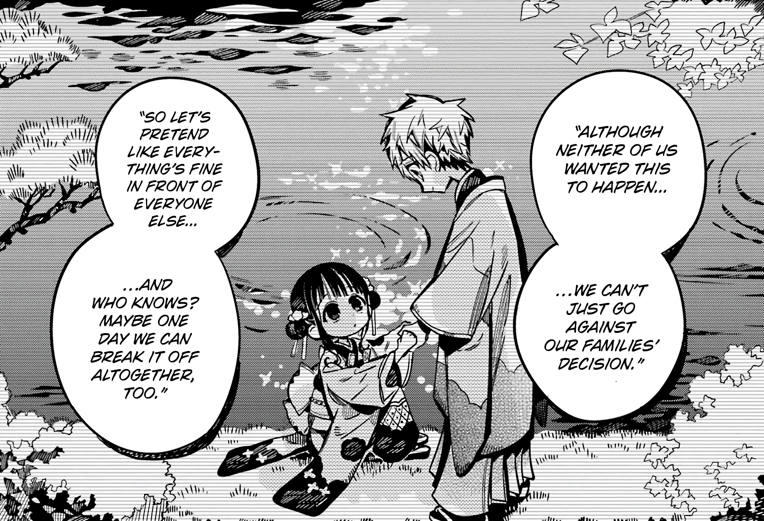 Aoi continues with her talk, telling Teru that their engagement became official when she was seven-years old, right after her dad left. She also said that her mother strongly supported the engagement and that rather than marrying out of love, she thought that an arranged marriage between families was safer. She admitted that she didn't want to get engaged and she was at loss as to what she wanted to do, but she reminded Teru that when he found her alone in the garden, he told her this: